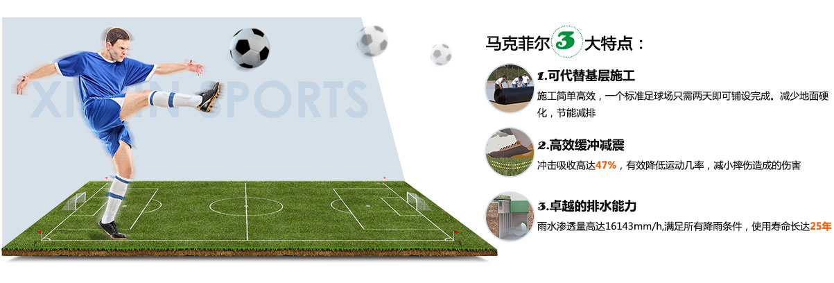 馬克菲爾足球場多功能基層墊是一款專用于人造草足球場的基礎墊層,以其卓越的性能和創(chuàng)新的系統(tǒng)設計滿足最高端的場地要求。是一款徹底顛覆傳統(tǒng)足球場基礎建造方案的革命性產(chǎn)品。其多功能表現(xiàn)為:可替代水泥和瀝青基礎,高效緩沖減震以及卓越的排水能力和球場穩(wěn)定性。