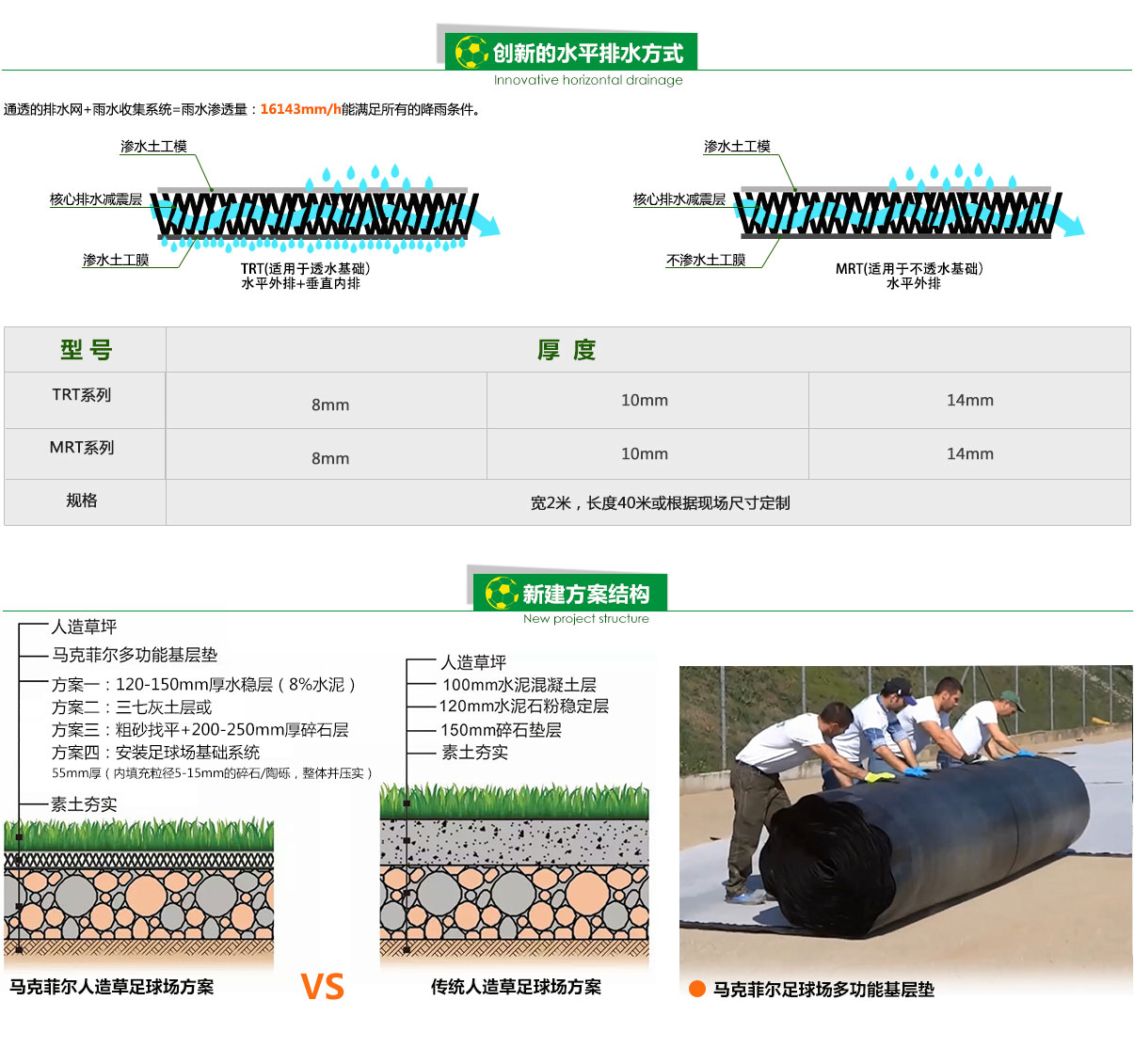 傳統(tǒng)人造草足球場,直接將人造草鋪設于水泥混凝土上,僅靠石英砂和填充顆粒進行緩沖,且沒有排水空間,震動吸收和基層滲透都難以達到標準。