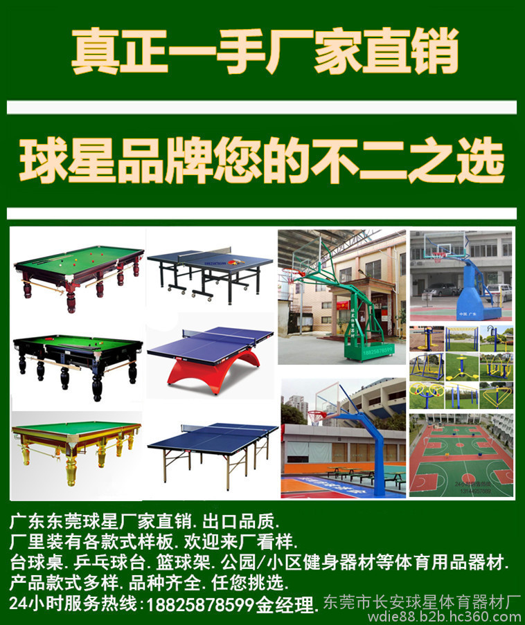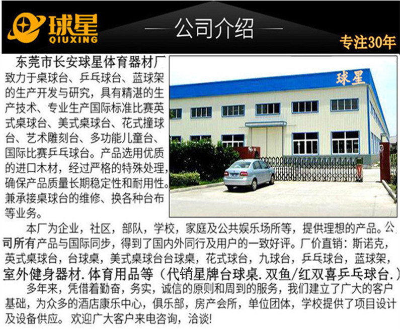 東莞市長安球星體育器材廠集三十多年管理、制造經(jīng)驗(yàn),專業(yè)制造桌球臺(tái)、乒乓球臺(tái)、籃球架、桌上足球.公園.小區(qū)健身器材等./等體育用品。秉著質(zhì)量至上,信譽(yù)好的原則,所做產(chǎn)品深受客戶好評(píng)。桌球臺(tái)、乒乓球臺(tái)、籃球架.桌上足球.公園小區(qū)健身器材五個(gè)系列產(chǎn)品遠(yuǎn)銷歐洲,南、北美洲,澳大利亞及部分阿拉伯**。