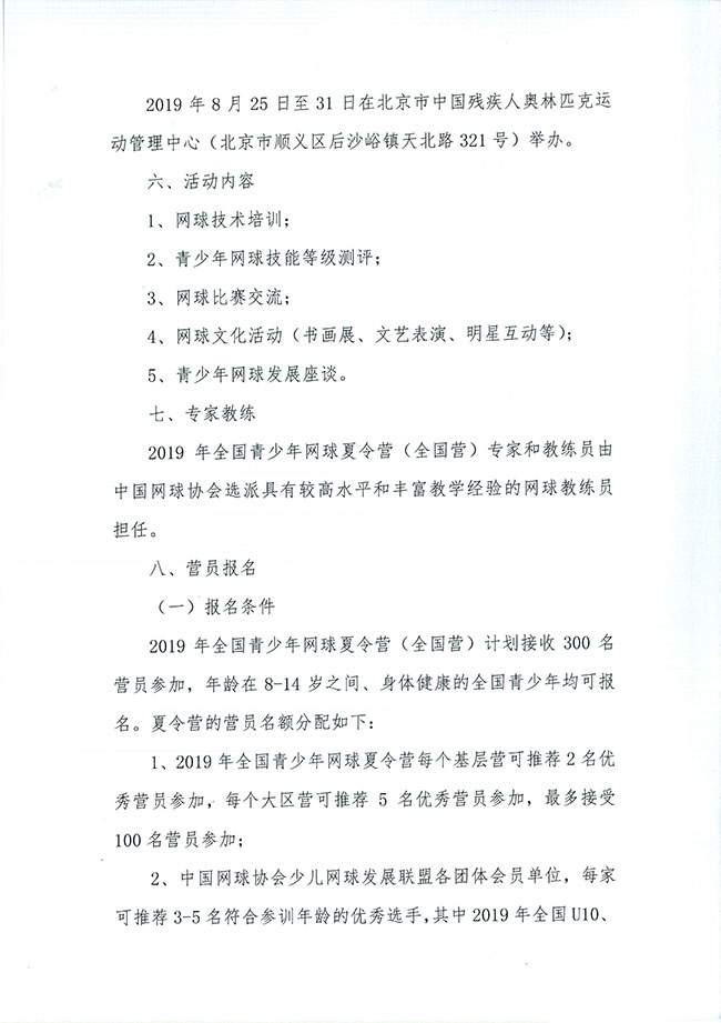 關(guān)于舉辦2019年全國青少年網(wǎng)球夏令營(全國營)的通知