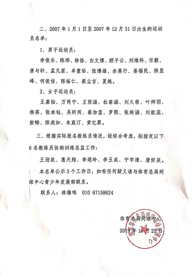 關于獲得2020年度國家少年網(wǎng)球隊運動員選拔提名資格名單的公示