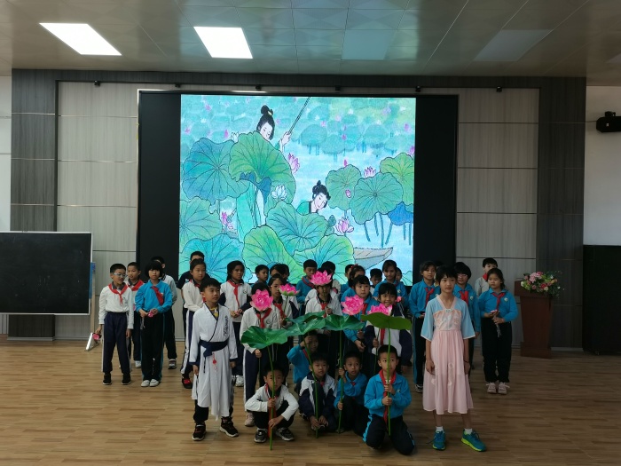 接著進行比賽的是中年級學生。三、四年級的學生各個精神抖擻,信心十足。有的班級穿上漢服,一展古韻風姿;有的班級手拿表演道具,讓表演更加精彩。其中三(3)班的孩子拿著荷葉、荷花,吟誦著《采蓮曲》,宛如把聽眾帶進詩的世界。