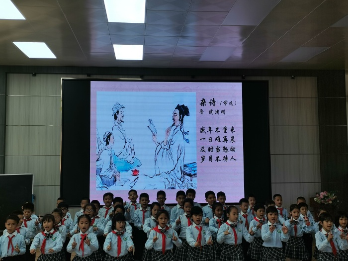最后進行比賽的是高年級學生。五、六年級的學生吟誦起來更有一番韻味,學生的朗誦聲響亮整齊,讓人特別享受。