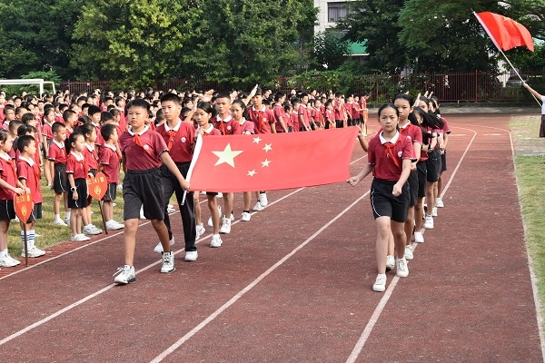 早上八點(diǎn)整,全體少先隊(duì)員佩戴鮮艷的紅領(lǐng)巾在操場上集合?;顒?dòng)在莊嚴(yán)的中華人民共和國國歌中拉開了序幕。首先,主持人宣布本次少先隊(duì)微儀式正式開始。出隊(duì)旗,唱隊(duì)歌,全場少先隊(duì)員莊嚴(yán)肅立,高聲齊唱中國少年先鋒隊(duì)隊(duì)歌“不怕困難,不怕敵人,頑強(qiáng)學(xué)習(xí),堅(jiān)決斗爭,向著勝利勇敢前進(jìn)......”。嘹亮的歌聲響徹整個(gè)會(huì)場,唱出了同學(xué)們愛國的激情。出旗、敬隊(duì)禮、唱隊(duì)歌、呼號(hào)、重溫誓詞等一系列莊嚴(yán)的儀式給所有的少先隊(duì)員們上了一節(jié)生動(dòng)的愛國教育課。