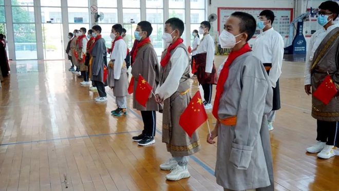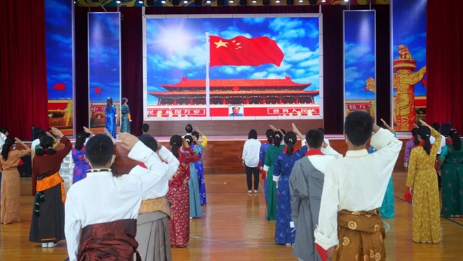 54名西藏班學(xué)生身著民族服裝,精神飽滿,伴隨著莊嚴(yán)的《義勇軍進(jìn)行曲》,滿懷敬意地注視著五星紅旗冉冉升起。