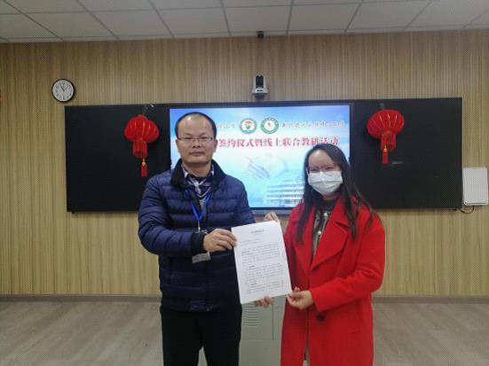 在潘曉雯老師介紹本次教研活動流程以后。首先是李少強校長與河頭鎮(zhèn)中心小學到我校跟崗學習的練麗梅主任進行簽約儀式。