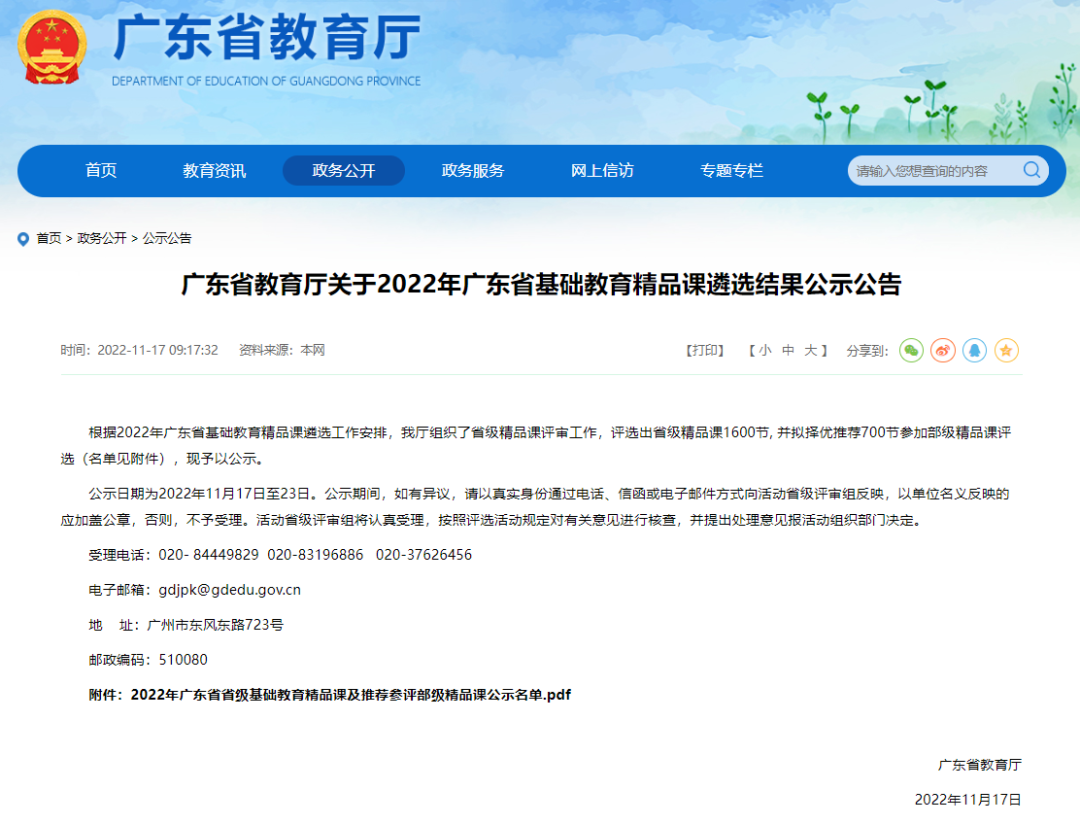 近日,廣東省教育廳公布了2022年廣東省基礎(chǔ)教育精品課遴選結(jié)果,共評選出省級精品課1600節(jié),并擬擇優(yōu)推薦700節(jié)參加部級精品課評選,其中順德區(qū)有43節(jié)課程上榜,我校數(shù)學(xué)科組賈中偉老師的課例名列榜上。