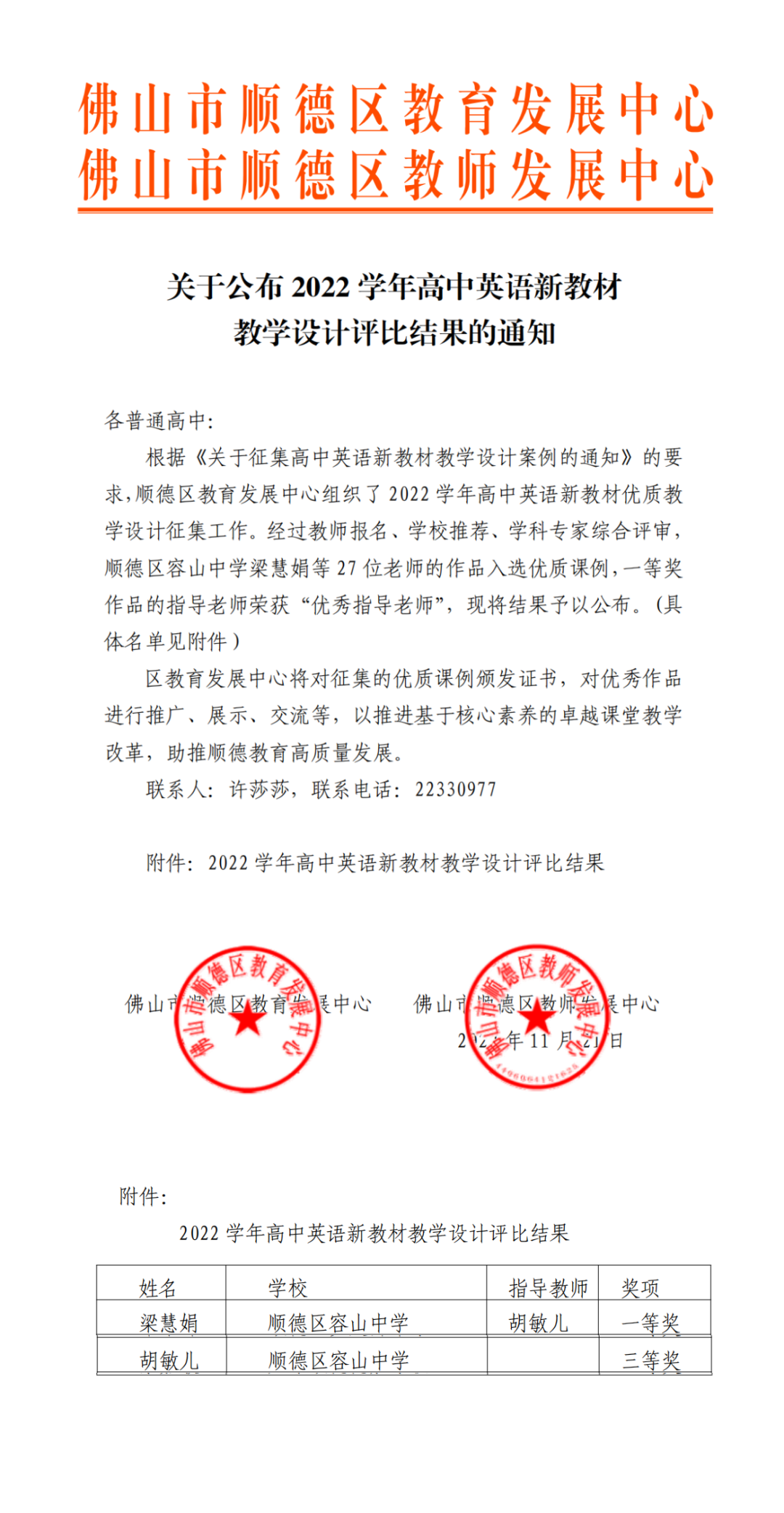根據(jù)《關(guān)于征集高中英語新教材教學(xué)設(shè)計(jì)案例的通知》的要求,順德區(qū)教育發(fā)展中心組織了2022學(xué)年高中英語新教材優(yōu)質(zhì)教學(xué)設(shè)計(jì)征集工作。近日,順德區(qū)教育發(fā)展中心公布了2022學(xué)年高中英語新教材教學(xué)設(shè)計(jì)評(píng)比結(jié)果。我校英語科組梁慧娟老師的作品榮獲本次評(píng)比一等獎(jiǎng)第一名,該作品的指導(dǎo)老師胡敏兒獲評(píng)“優(yōu)秀指導(dǎo)老師”,同時(shí)胡敏兒老師的作品也獲得本次評(píng)比活動(dòng)的三等獎(jiǎng),她們的作品均入選順德區(qū)優(yōu)質(zhì)課例。