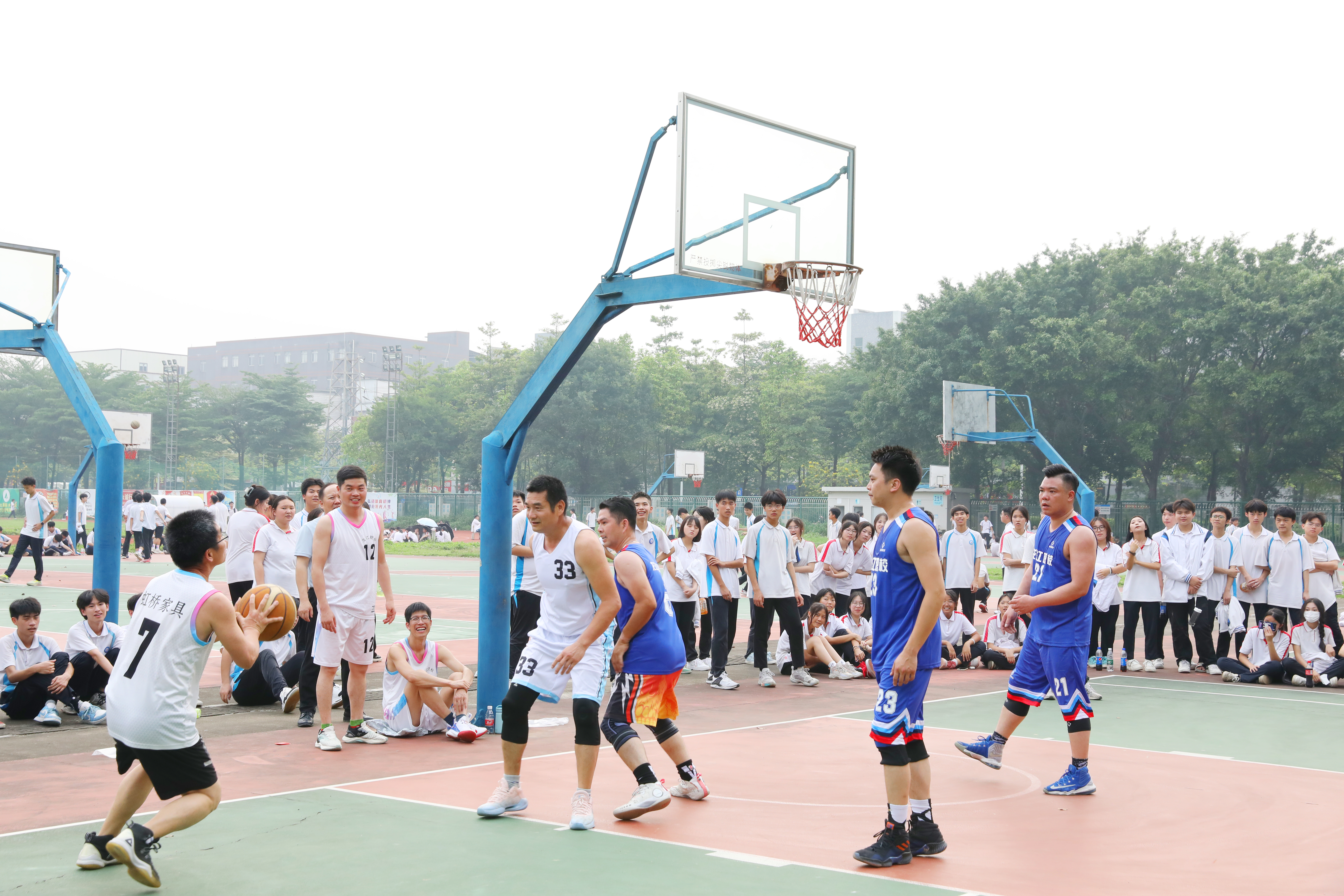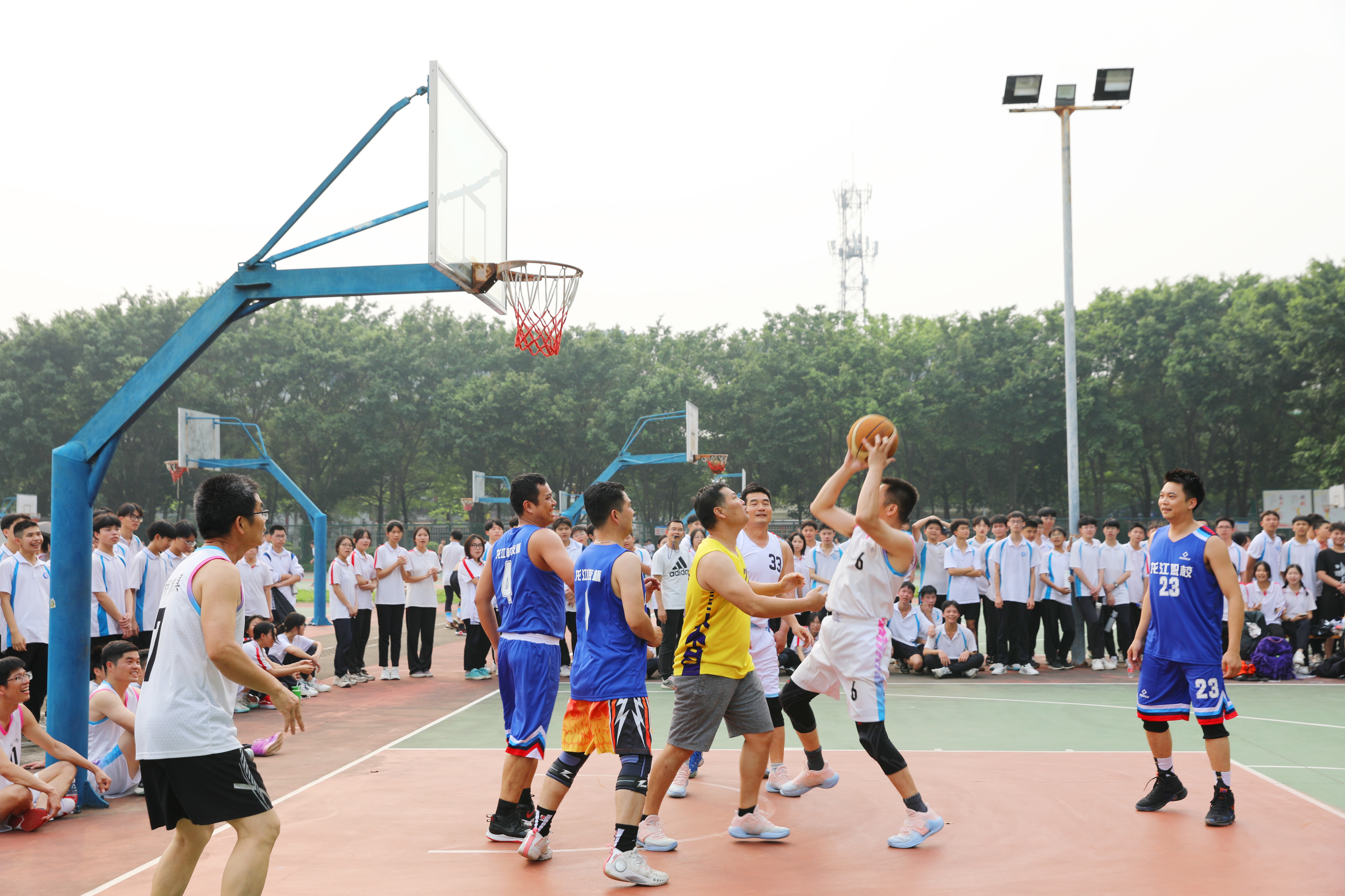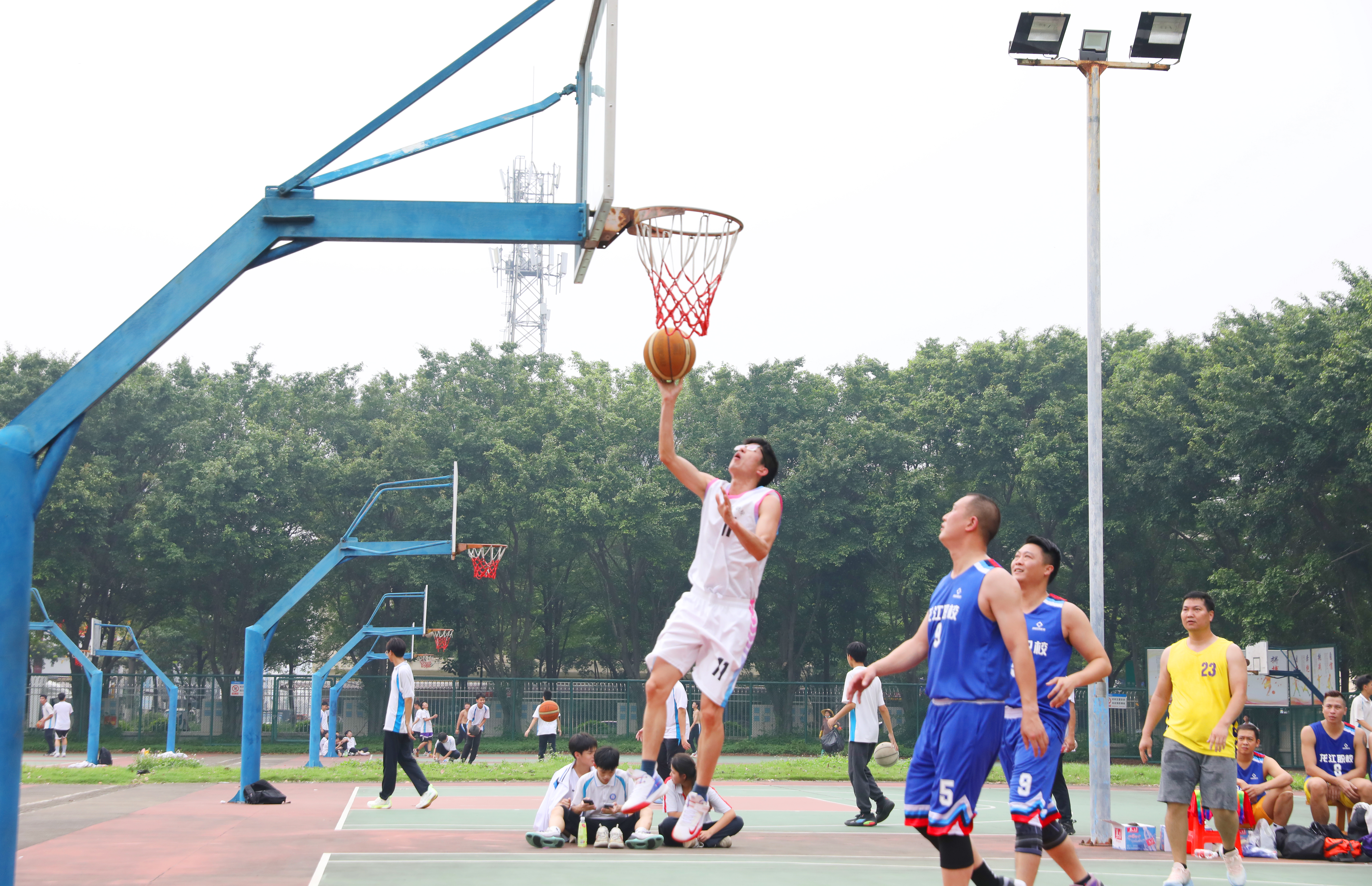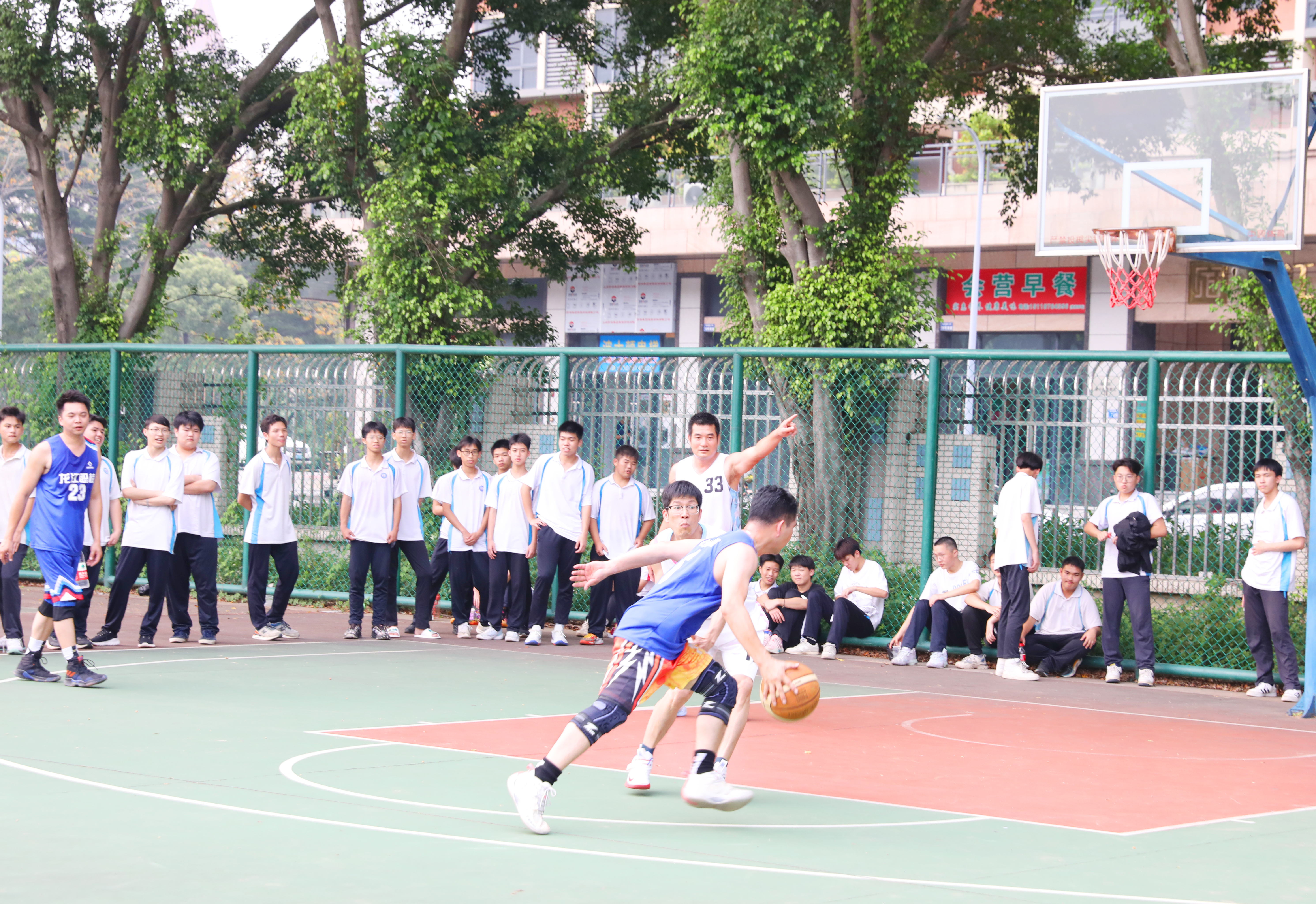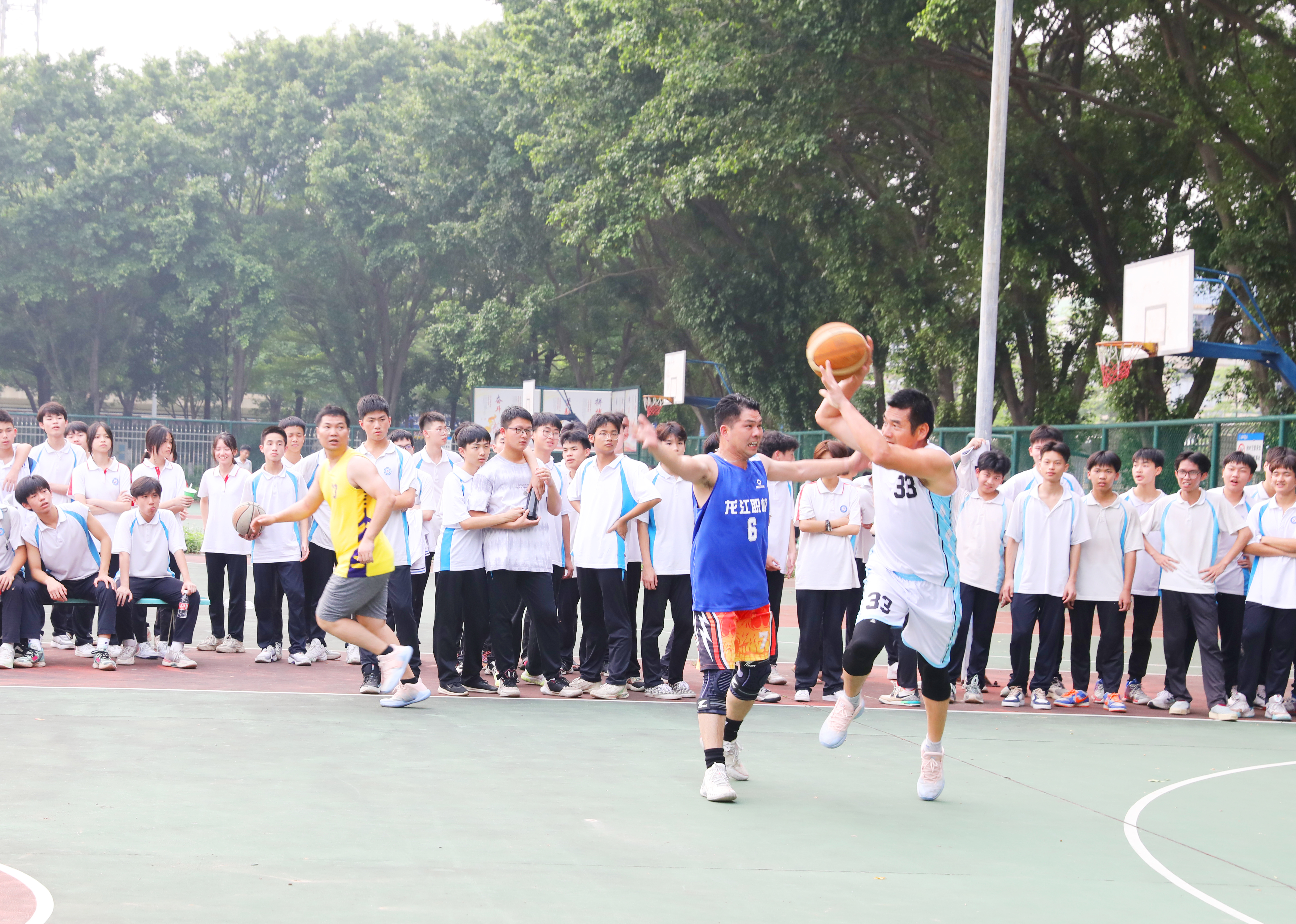 籃球場上,校友隊(duì)迎“籃”而上,教師隊(duì)奮發(fā)追“球”。選手們盡情釋放活力,漂亮的傳球、敏捷的轉(zhuǎn)身、果敢的搶斷、機(jī)智的快攻與拆擋等一個個精彩瞬間讓在場學(xué)生觀眾應(yīng)接不暇。校友隊(duì)的三分球高頻輸出,上演真實(shí)版“灌男高手”,拉高現(xiàn)場氣氛。教師隊(duì)也不甘示弱,竭力使出蓋帽、搶籃板等招數(shù)與校友隊(duì)一決高下。球場不時傳出歡呼或嘆息,喝彩聲一浪接一浪,熱度不亞于火辣仲夏。