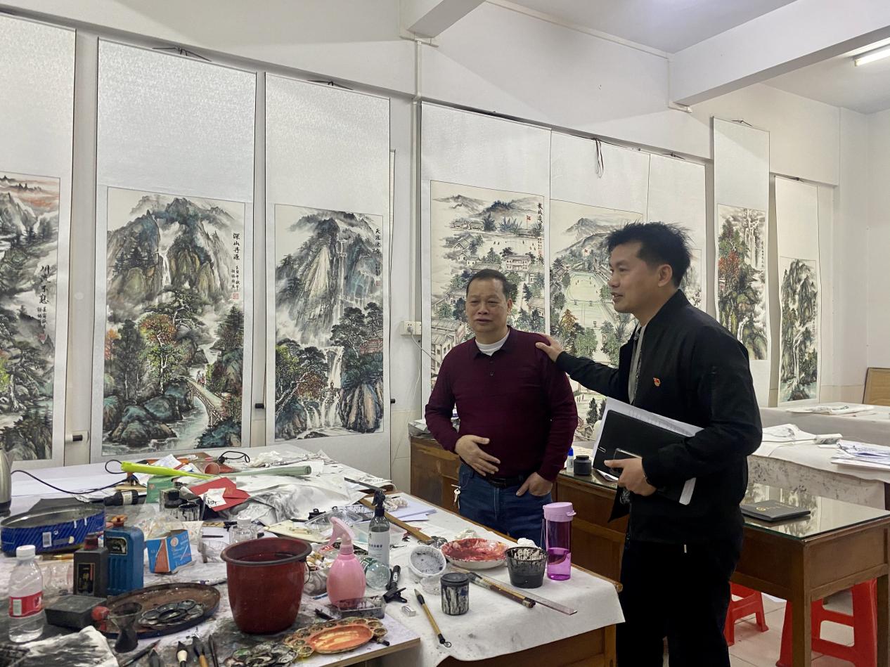 簽約儀式后,雙方召開了校地黨建“共建”座談會(huì),葉書記參觀了我校胡錫強(qiáng)老師國(guó)畫工作室,胡老師對(duì)自行創(chuàng)作的鄉(xiāng)土作品作了一一介紹。