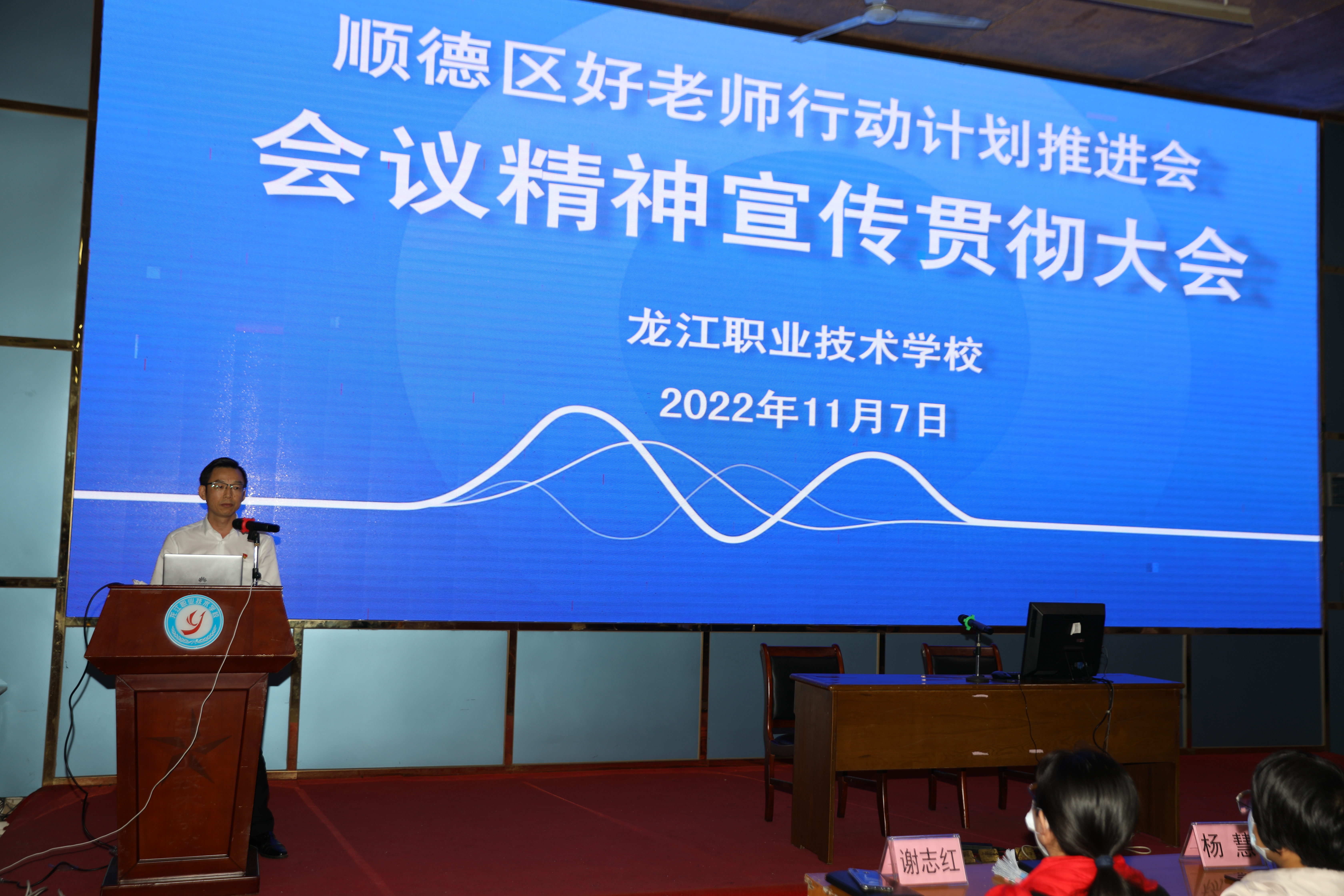 11月7日下午,龍江職校召開順德區(qū)好老師行動(dòng)計(jì)劃推進(jìn)會(huì)會(huì)議精神宣傳貫徹大會(huì)。陳義明校長(zhǎng)在會(huì)上指出,教育是黨政一把手工程,順德教育“四好”工程的宗旨是優(yōu)先發(fā)展教育,辦人民滿意的教育。