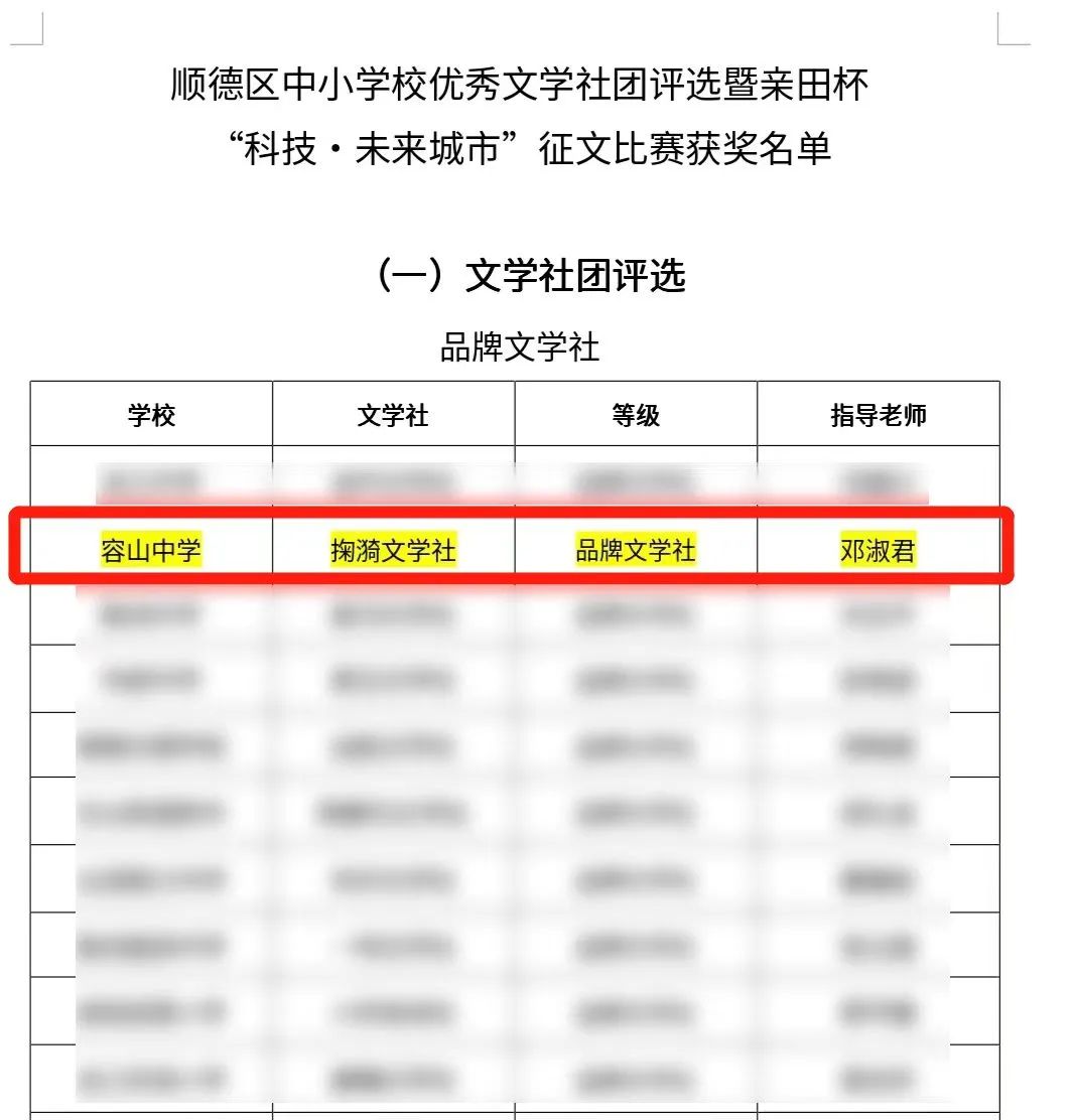 2022年11月順德區(qū)中小學校優(yōu)秀文學社團評選暨親田杯“科技·未來城市”征文比賽活動中,我校由鄧淑君、葉詩華老師指導的掬漪文學社以第二名的成績被評為“順德區(qū)品牌文學社團”,習禮根老師指導的林煥勝同學征文榮獲二等獎。