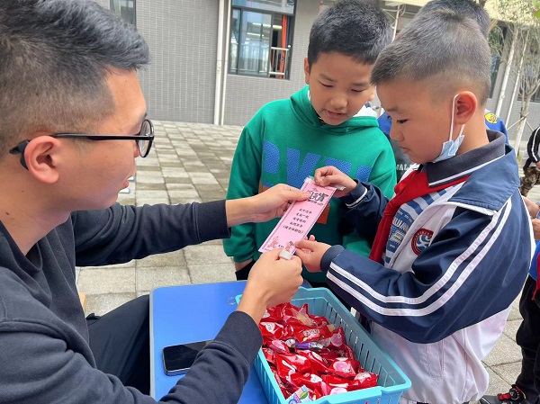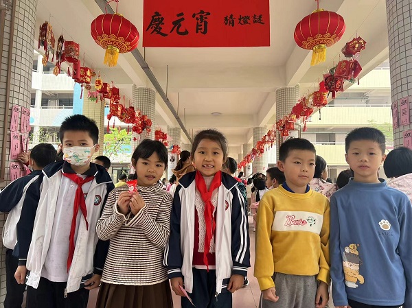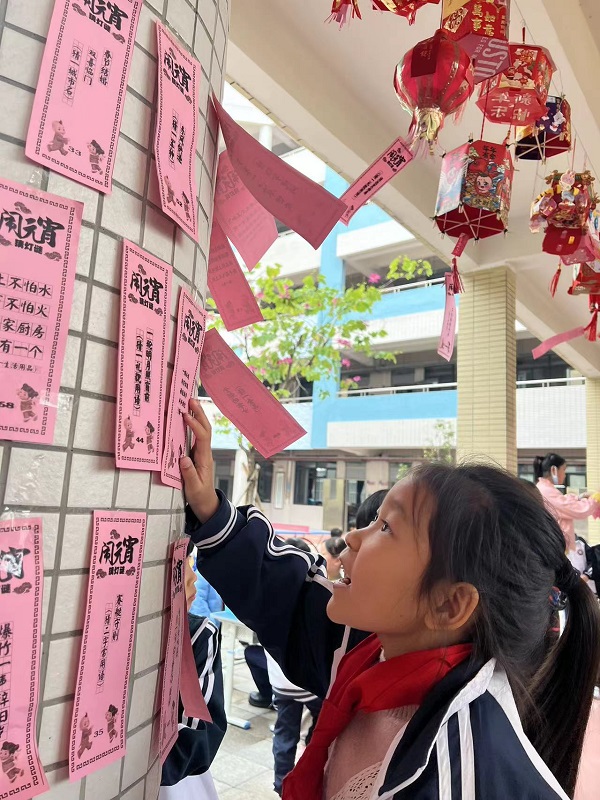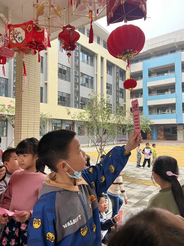 學(xué)生們在小燈籠前駐足仰面,輕捻燈謎標(biāo)簽,細(xì)細(xì)揣摩謎底。小小的燈謎激發(fā)學(xué)生們的奇思妙想,體驗到別樣的樂趣。準(zhǔn)確猜出答案的學(xué)生還能根據(jù)燈謎獲得一枚潤品章和糖果,整場活動充滿妙趣和童趣。