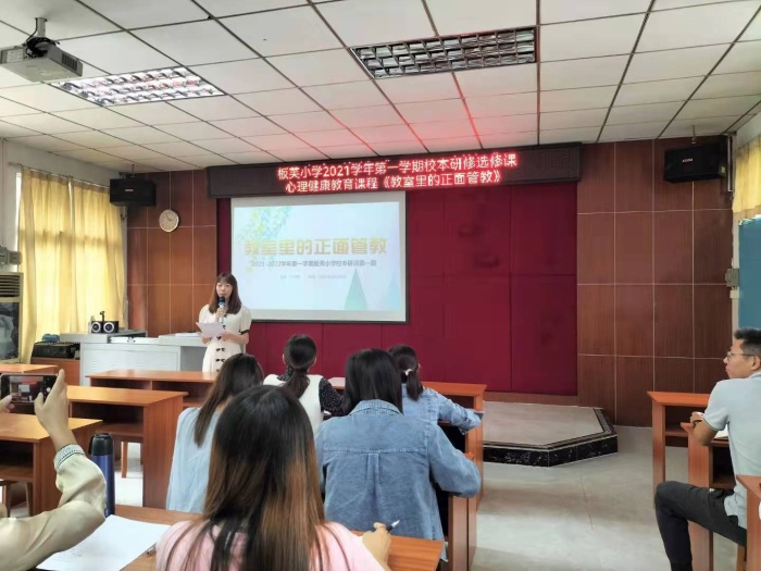 為了進(jìn)一步提高學(xué)校教師專(zhuān)業(yè)發(fā)展水平,提升學(xué)校發(fā)展核心競(jìng)爭(zhēng)力,板芙小學(xué)深挖校內(nèi)資源,以授課、講座等形式構(gòu)建板芙小學(xué)校本研修選修課程。2021年12月3日,吳丹婷老師在板芙小學(xué)階梯室開(kāi)展校本研修選修課程的第一次課程,題為《教室里的正面管教》的心理健康教育校本研訓(xùn)。