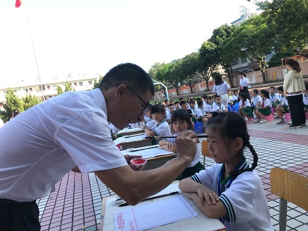 開筆禮第一環(huán)節(jié)是正衣冠,孩子們在低段語文科組長蔡老師的帶領(lǐng)下正衣冠,這是孩子們知書明理的第一步;隨后,在李杰華的帶領(lǐng)下,老師們?yōu)楹⒆觽冎焐皢⒅?,在他們的額頭中間點上朱砂印,祝福他們從此眼亮心明,啟迪智慧。第三環(huán)節(jié)由體育老師擊鼓明智,在三聲鼓聲中,孩子們跟隨謝老師明禮。第四環(huán)節(jié)由書法老師啟蒙描紅,李老師手握毛筆,飽蘸濃墨,在掛起的宣紙上教學(xué)生們一撇一捺寫下一個“人”字,寓意在人生的啟蒙階段學(xué)會做人是最為重要的。每班學(xué)生代表也在紙上認(rèn)認(rèn)真真地書寫“人”字并展示;最后一個環(huán)節(jié)是鞠躬敬師,全體老師上臺接受學(xué)生三鞠躬,接著向孔子畫像行“三拜禮”,表達尊敬敬師之情。