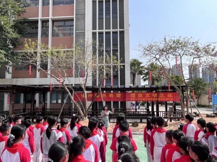 博凱小學(xué)校長胡冬梅在活動中致辭。胡校長與隊員們探討交流:我們?yōu)槭裁匆矘洌糠N植花草樹木后我們要如何做?我們種下的花草樹木它們身上有哪些品質(zhì)值得我們學(xué)習(xí)?胡校長希望同學(xué)們學(xué)習(xí)“野火燒不盡,春風(fēng)吹又生”般堅韌不屈的精神。她娓娓講述了身后那棵年初時新栽下的樹的故事,那是一棵曾被雷電劈中傷痕累累的樹,就在護林員以為它挺不過那年冬天時,它頑強地冒出了新芽,不拋棄不放棄。挑選移栽樹木時,這棵經(jīng)歷艱難困苦終卻重?zé)ㄐ律臉淞钊苏鄯谑撬鼇淼搅瞬﹦P校園,在這個書聲瑯瑯的春日里生發(fā)出點點綠芽,與博凱學(xué)子一起向陽生長。