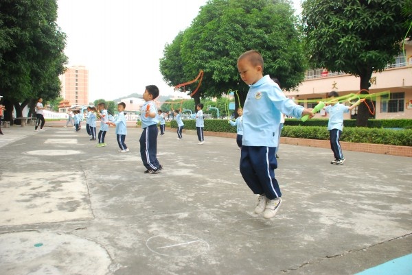 升旗臺下也是一片歡騰的景象。燦爛的陽光下一根根舞動的彩繩在不斷地跳躍,一個個純真的笑臉在閃爍著光芒,跳繩比賽開始了。裁判一聲哨響,繩子就飛快地甩了起來,不停地在學生腳底下穿梭著,猶如條條彩龍在飛舞。同學們使出渾身的解數(shù),揮舞的是短繩,悅動的是童年。
