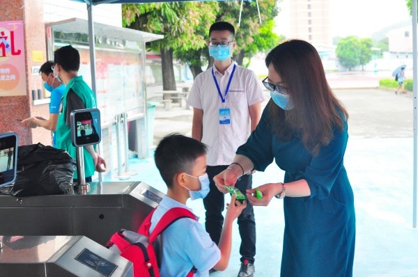 進(jìn)入教室后,每一位學(xué)生單人單桌,同向而坐。班主任立即登記到班人數(shù),進(jìn)行晨檢,登記體溫。