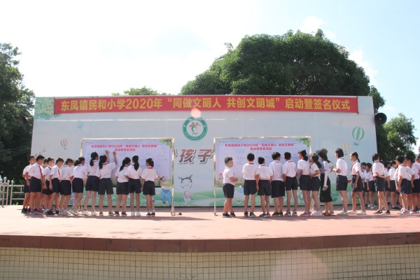 根據(jù)《中山市教育和體育局關(guān)于在全市中小學幼兒園開展“六個一”創(chuàng)文實踐活動的通知》精神,為參與、推動全國文明城市創(chuàng)建工作,7月13日上午,東鳳鎮(zhèn)民和小學舉行了主題為“同做文明人,共創(chuàng)文明城”啟動暨簽名儀式。