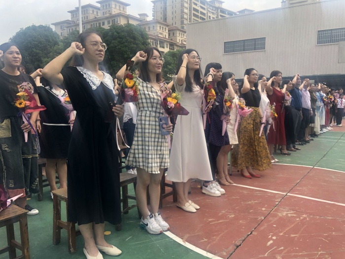 上午8:30,活動(dòng)在莊嚴(yán)的升旗儀式中拉開(kāi)帷幕。林偉光校長(zhǎng)在學(xué)生的歡呼雀躍聲中帶領(lǐng)全校90多位教師走過(guò)紅地毯入場(chǎng)就座。首先,小瀝小學(xué)古箏社團(tuán)和合唱隊(duì)奏唱《聽(tīng)我說(shuō)謝謝你》,他們用琴聲、歌聲和手語(yǔ)表達(dá)對(duì)老師的敬愛(ài)之情。隨后,小瀝小學(xué)少先隊(duì)員代表為全體教師送上了一束鮮花,五年級(jí)的少先隊(duì)員給老師們帶來(lái)《教師誦》。緊接著,小瀝小學(xué)全體教師在黎三妹副校長(zhǎng)的帶領(lǐng)下宣誓,向全體學(xué)生和全社會(huì)做出莊嚴(yán)的承諾:立德樹(shù)人奮進(jìn)擔(dān)當(dāng),教育脫貧托舉希望!最后,林偉光校長(zhǎng)和五(1)班家長(zhǎng)代表為30多年如一日盡職盡責(zé)、愛(ài)生如子的高淑英老師送上“守正育德”的牌匾,表示對(duì)她最衷心的感謝和最誠(chéng)摯的祝愿。