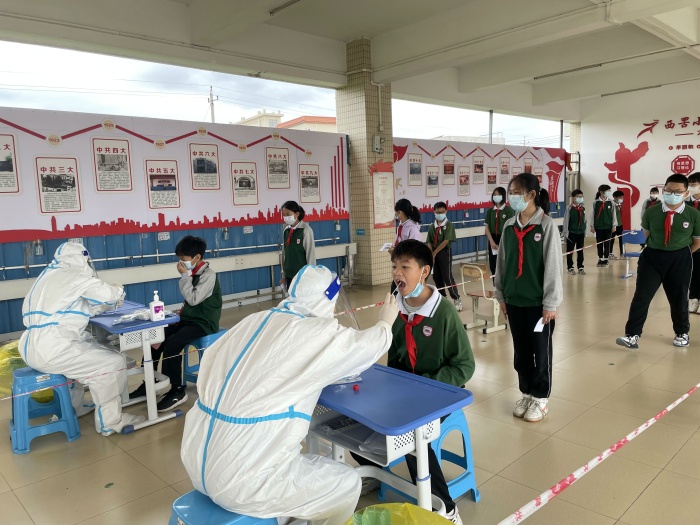 下午1點(diǎn),全校老師嚴(yán)格按照學(xué)校防控工作要求,積極配合做好采樣工作。黨員志愿者、教師志愿者等深入一線,充分發(fā)揮先鋒模范作用,檢測(cè)現(xiàn)場(chǎng)進(jìn)行引導(dǎo)秩序維護(hù)等工作,確保核酸檢測(cè)現(xiàn)場(chǎng)規(guī)范有序?,F(xiàn)場(chǎng),醫(yī)護(hù)工作人員仔細(xì)進(jìn)行核酸檢測(cè),孩子們?cè)邳h員志愿者、教師志愿者的指引下,有序排隊(duì)等候,10人一組登記信息,2個(gè)檢測(cè)單元同時(shí)展開(kāi)采樣。采樣過(guò)程中,下起了小雨,學(xué)校負(fù)責(zé)人及時(shí)啟動(dòng)應(yīng)急預(yù)案,有條不紊安排工作,確保核酸檢測(cè)順利進(jìn)行。