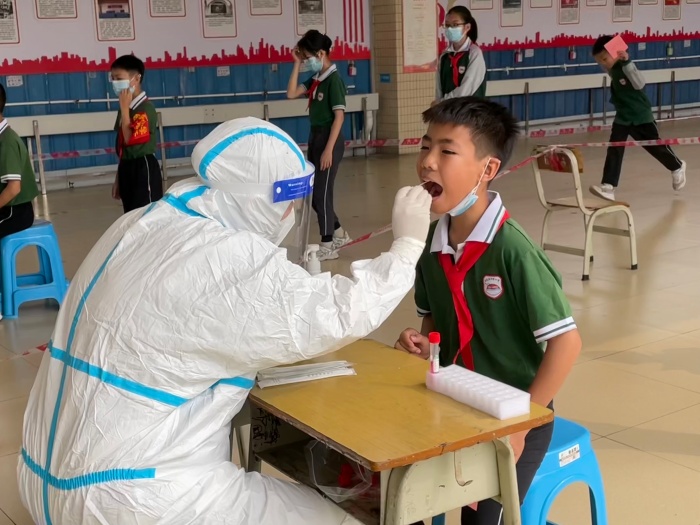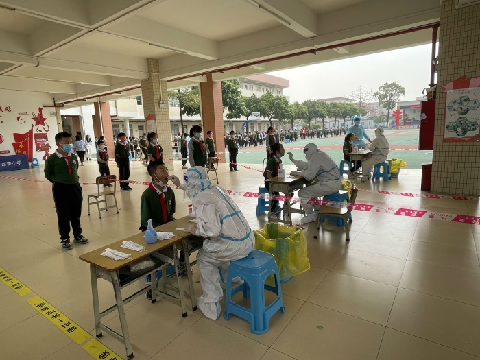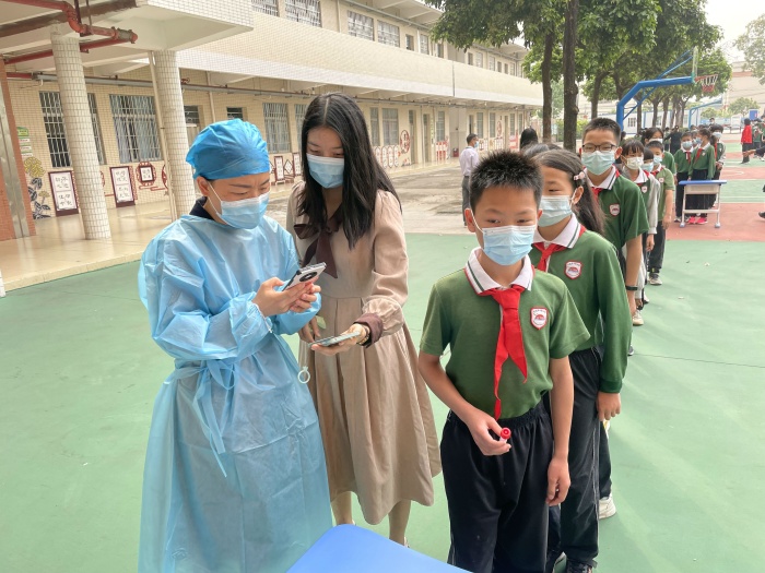 當(dāng)天上午9點(diǎn),醫(yī)務(wù)人員到達(dá)學(xué)校后,檢測(cè)有條不紊地開始了。調(diào)度的調(diào)度,測(cè)溫的測(cè)溫,掃碼的掃碼,引導(dǎo)的引導(dǎo),檢測(cè)的檢測(cè),所有人員密切配合,學(xué)生們間隔1米,在老師們的清晰指引下,按照班別、小組依次進(jìn)行核酸檢測(cè),整個(gè)過程井然有序。