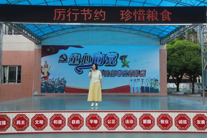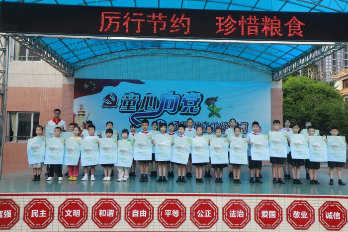 隨后,教務(wù)處趙郭皓副主任帶領(lǐng)全校師生齊誦“惜食節(jié)儉”的古詩詞名句,感受和傳承中華節(jié)儉美德。簡短的誦讀中,大家深深感悟到:當(dāng)今時(shí)代人們雖然不再缺衣少食,但土地能承載和產(chǎn)出的資源始終有限,“厲行節(jié)約、反對(duì)浪費(fèi)”的傳統(tǒng)不能忘、不能丟。最后林小舟校長向每個(gè)班級(jí)代表頒發(fā)了“珍惜糧食,粒粒辛苦”的宣傳海報(bào),倡議全體少先隊(duì)員從小事做起,從自己做起,從點(diǎn)滴做起,節(jié)約每一粒米,共同養(yǎng)成勤儉節(jié)約好習(xí)慣。