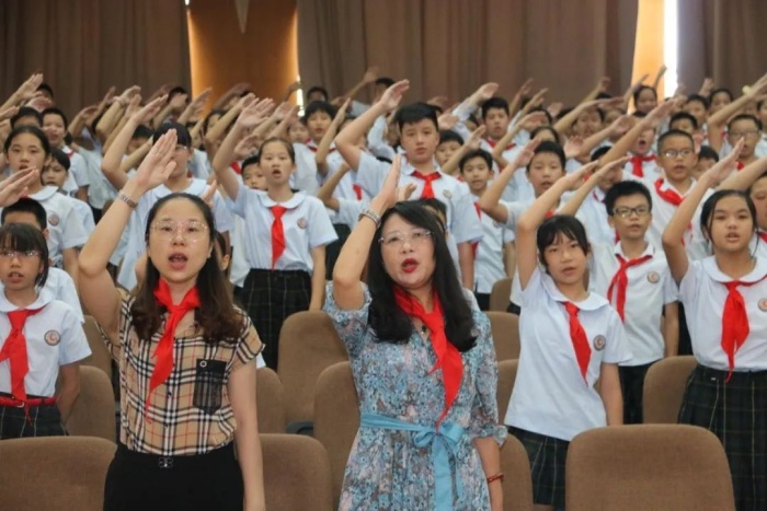 第二部分為一至五年級大隊開展“禮贊中國”慶國慶活動,隊員們和準隊員們通過“革命歌曲贊祖國、詩歌誦祖國”等環(huán)節(jié),了解祖國歷史,唱出對祖國的熱愛,誦出作為中國人的自豪。