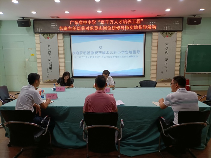 座談會由水云軒小學副校長黃文燦主持。座談會伊始,林小舟校長代表學校對羅明星導師、區(qū)領(lǐng)導的蒞臨指導表示熱烈歡迎和衷心感謝,對莫杰老師入選為廣東省中小學“百千萬人才培養(yǎng)工程”小學名班主任培養(yǎng)對象表示熱烈祝賀,并向羅教授介紹了水云軒小學教育教學基本情況以及班主任隊伍建設(shè)的政策支持與做法。