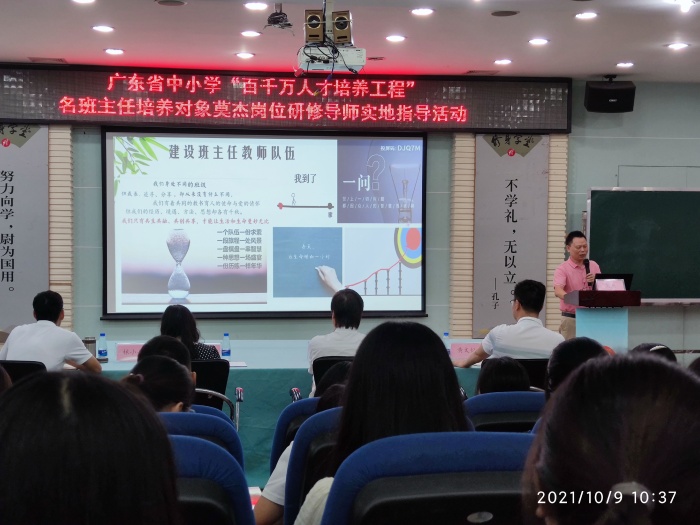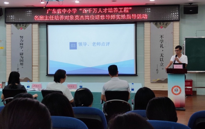 接著,黃文燦副校長匯報了學校在促進教師專業(yè)發(fā)展、提升班主任隊伍建設(shè)的具體做法,通過搭建“專家引領(lǐng)帶發(fā)展、師徒結(jié)對同成長、理論修養(yǎng)學習、教學實踐交流、教育教學研究、閱讀推動、外出交流學習、各項賽課、特色班集體的建設(shè)”等多種平臺,引領(lǐng)班主任實現(xiàn)“青年教師——新秀教師——骨干教師——名師”的梯度成長,全方位助推青年教師專業(yè)成長以及整個教師隊伍尤其是班主任的專業(yè)發(fā)展。