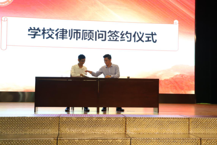 為了讓學(xué)校的法制工作開展得更加順暢,學(xué)校聘請東區(qū)起灣派出所警員李木生為學(xué)校法制輔導(dǎo)員,聘請東區(qū)起灣派出所副所長羅勇彬為學(xué)校法制副校長,林校長為他們頒發(fā)了聘書。同時,學(xué)校還聘請了廣東凱行律師事務(wù)所朱志強律師為學(xué)校專業(yè)的律師顧問,并進行了簽約。