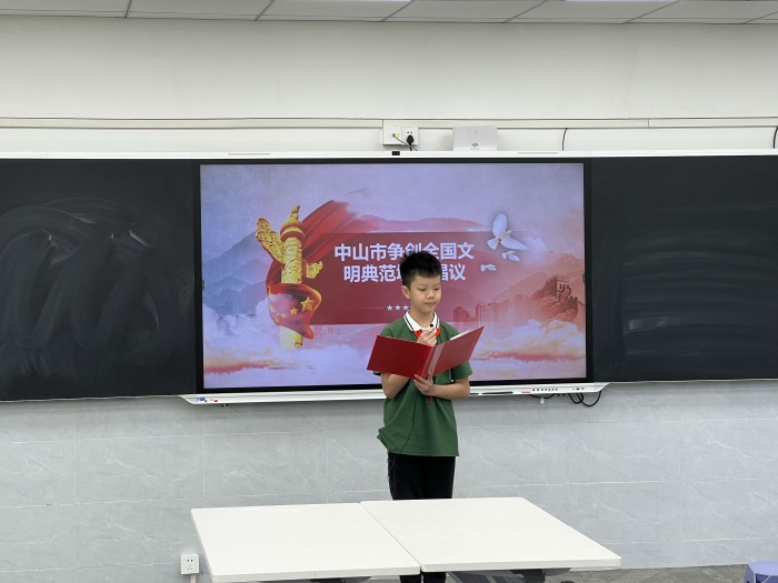 首先,大隊(duì)委宣讀《爭創(chuàng)全國文明典范城市倡議書》。倡議全校同學(xué):主動(dòng)參與,爭做文明創(chuàng)建的傳播者;身體力行,爭做文明創(chuàng)建的實(shí)踐者;沖鋒在前,爭做文明創(chuàng)建的先鋒隊(duì)。