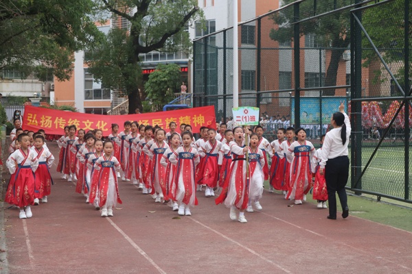 接著是從101班開始,到905班的方隊(duì)依次入場(chǎng),在經(jīng)過(guò)主席臺(tái)時(shí),獻(xiàn)上本班精心準(zhǔn)備的節(jié)目,以此方式慶賀學(xué)校第十四屆體育節(jié)開幕。節(jié)目主題一致但形式卻又多樣,《朝代歌》《弟子規(guī)》《中國(guó)字中國(guó)人》《中華孝道》《唐詩(shī)里讀中國(guó)》《禮儀之邦》;表演形式有手勢(shì)舞、手語(yǔ)操、舞蹈、武術(shù)、詩(shī)歌。各自精彩各有特色。四十多個(gè)精彩的節(jié)目,為現(xiàn)場(chǎng)觀眾帶來(lái)一場(chǎng)視覺盛宴。大家情不自禁地拿出相機(jī)和手機(jī),將這些精彩的節(jié)目錄制下來(lái)與家人朋友分享。學(xué)校特聘顧問(wèn)、中學(xué)高級(jí)教師楊秋香老師興奮地對(duì)本校記者說(shuō),她為了今天的活動(dòng)昨晚特意把手機(jī)內(nèi)存清空了,但發(fā)現(xiàn)今天的手機(jī)內(nèi)存還是不夠用,她說(shuō),節(jié)目太精彩了,忍不住拍了一百多條視頻。