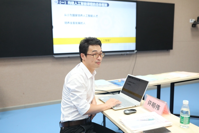 會議第一項,課題主持人許明偉老師做課題研究結題報告匯報。他分別從研究背景、研究實施、研究成效、研究思考還有研究收獲七個方面,對課題的研究過程和研究結果,進行了詳盡的總結匯報。匯報中,許老師緊緊圍繞課題的研究目標,圍繞研究內容,沿著課程開發(fā)的過程展開深入研究。課題組梳理了人工智能教育的現狀與不足,構建了新形勢的“1+2”的人工智能教育課程體系,并開發(fā)設計了校本化的人工智能學生項目手冊;課題組積極開展體驗課程、思維課程與實踐課程的教學實踐,基于學生的認知水平,對應以體驗式教學、基于問題解決和項目學習的教學策略展開教學,并提煉出課程實施的教學模式,形成了可操作、可推廣的經驗。課題組還將課程開發(fā)與實踐的經驗撰寫成四篇論文,分別發(fā)表在《教育信息技術》,《中國信息技術教育》和《中小學信息技術教育》等信息技術教學權威雜志上。