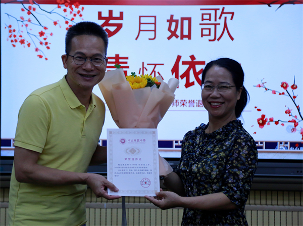 然后,謝柏芳校長(zhǎng)代表學(xué)校向楊金娥老師頒發(fā)了榮譽(yù)退休證書,對(duì)楊老師在東區(qū)中學(xué)取得的成績(jī)給予了充分肯定,對(duì)楊老師為學(xué)校作出的貢獻(xiàn)表示衷心感謝,并祝愿楊老師退休生活更精彩。