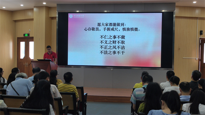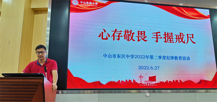 為持續(xù)加強學校黨風廉政建設(shè),筑牢廣大黨員干部和教職工拒腐防變的思想道德防線,6月27日下午,中山市東區(qū)中學舉行主題為“心存敬畏 手握戒尺”的2022年第二季度紀律教育學習月活動?;顒佑尚|h總支委員楊群同志主持,全體教職工參與學習。