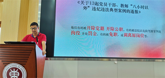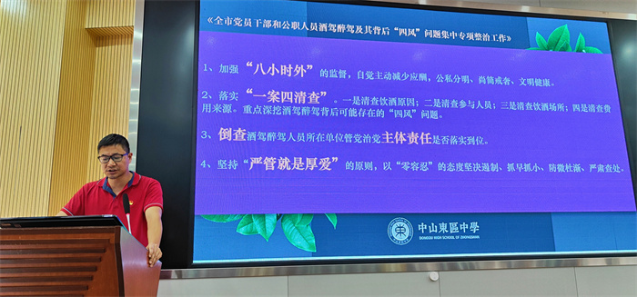 會上,蔡昌盛同志帶領(lǐng)全體教職工學習了《關(guān)于在全市開展黨員干部和公職人員酒駕醉駕及其背后“四風”問題專項整治的工作方案》。同時,對個別黨員干部、教師“八小時以外”違紀違法典型案例的通報進行了再學習,為全體教職工明確了糾“四風”和酒駕醉駕重點工作及相關(guān)要求。要求全體教職員工提高思想認知,端正工作態(tài)度,堅決杜絕頂風違紀行為,進一步積極營造風清氣正的工作氛圍。同時,對全體教職工提出倡議,希望大家提高思想覺悟,守住生活警戒線,帶頭遵守法律法規(guī)、黨紀黨規(guī)、社會公德。自覺主動減少應(yīng)酬,把時間和精力用在干事創(chuàng)業(yè)和陪伴家人上,樹立公私分明、尚簡戒奢、文明健康的新風正氣。