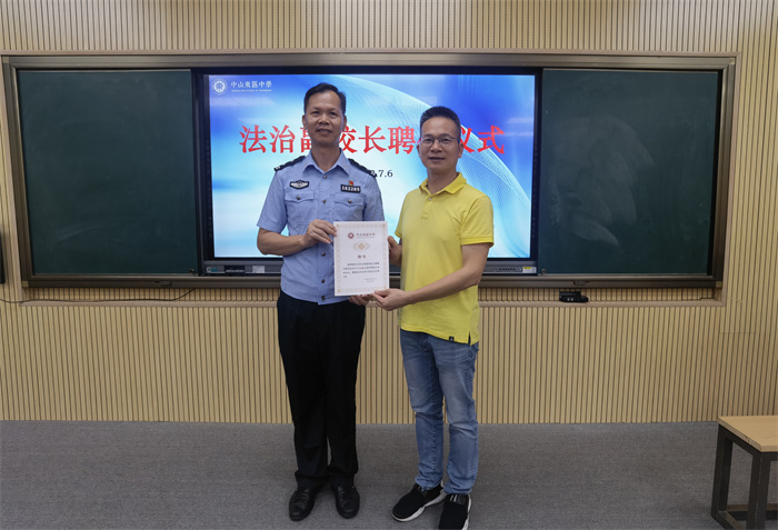 在講座開始前,東區(qū)中學(xué)謝柏芳校長為紫馬嶺派出所李子余副所長頒發(fā)聘書,聘請李子余副所長為我校法治副校長。