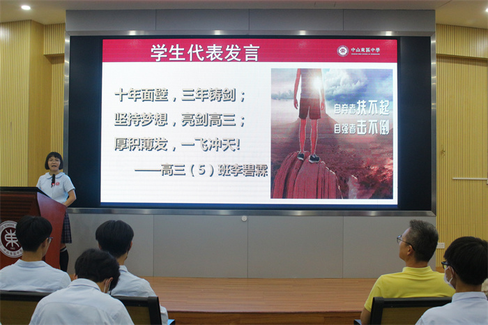 接著,高三5班李碧霖同學(xué)代表高三全體同學(xué)作了發(fā)言。李碧霖同學(xué)指出要重視積累,刻苦學(xué)習(xí),努力奮斗,為高考全力以赴,不負(fù)家長(zhǎng)和老師的期待。最后她號(hào)召高三學(xué)子,用勤奮做槳,以信念為帆,開動(dòng)理想的大船,勇掀千層浪,摘得桂冠還!