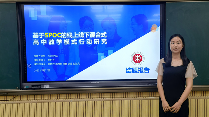 謝柏芳校長(zhǎng)主持的課題《基于SPOC的線上線下混合式高中教學(xué)模式行動(dòng)研究》以后疫情時(shí)代較為流行的線上線下混合式教學(xué)為研究主題,結(jié)合最新的SPOC理念,探索在高中日常教學(xué)中開展適合校情的分層不分班的混合式教學(xué)模式。該課題由課題組成員楊婷婷老師代表匯報(bào)。楊老師在匯報(bào)中著重介紹了課題的研究過程和研究結(jié)果。從前期的師生調(diào)查到兩輪教學(xué)實(shí)踐對(duì)模式的修正調(diào)整,再到最后形成模式,楊老師對(duì)課題組的研究過程做了詳細(xì)的展示。經(jīng)過兩年的研究,該課題組發(fā)表了論文4篇,獲獎(jiǎng)7篇,沉淀了三本校本教材、教學(xué)資源庫(kù)和學(xué)生的個(gè)性化學(xué)習(xí)檔案袋等大量的一手資料,并多次走出去引進(jìn)來交流推廣,取得了一定的成效。