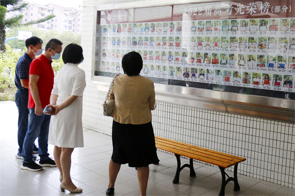 走到折桂路上,馮副主席指出,桂花樹下的條木椅和四墩上刻著的詩詞這一設(shè)計(jì)非常好,讓同學(xué)們在休憩的閑暇,也可以有意無意地欣賞中國古詩詞,浸潤中國優(yōu)秀傳統(tǒng)文化。當(dāng)聽到謝柏芳校長介紹折桂路的來歷,以及謝校長會在折桂路上為優(yōu)秀的同學(xué)拍照紀(jì)念的時候,馮副主席更加肯定學(xué)校這種非常用心用情做教育的做法和情懷。