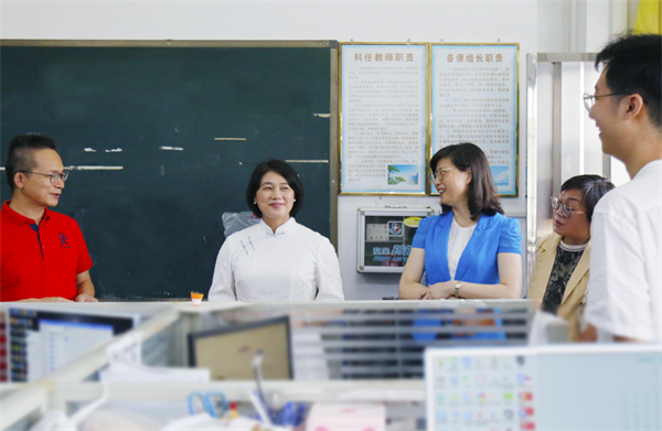 隨后,馮金怡副主席一行走進(jìn)教師辦公室,看望慰問正在備課的一線教師們。“祝老師們教師節(jié)、中秋節(jié)快樂,感謝你們對教育事業(yè)的付出和貢獻(xiàn)!”看到一個個充滿青春朝氣的老師,馮副主席坦言自己一下子回到了當(dāng)年從教的時光,雖然工作有變動,但自己對教育始終念念不忘,始終關(guān)注教育,傾情教育,雖然自己不在教育崗位上,但在工作中愈發(fā)感受到教育的重要、教師的偉大。走訪中,市、局領(lǐng)導(dǎo)與教師們親切交談,聆聽教師心聲,送上市委、市政府的關(guān)懷與問候。