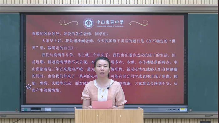 疫情雖然阻攔了師生們走進(jìn)校園的腳步,卻阻攔不了我們教與學(xué)的腳步。為進(jìn)一步做好疫情期間的教育教學(xué)工作,促進(jìn)學(xué)生居家期間高效學(xué)習(xí)和身心健康發(fā)展,11月28日上午,中山市東區(qū)中學(xué)采用線上直播的方式進(jìn)行第十四周升旗禮和班會(huì)課,化疫情危機(jī)為教育契機(jī),讓德育工作不缺位,讓學(xué)生成長(zhǎng)不延期。
