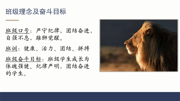 高三7班雄獅班,獅子是一種群居動物,它們分工細致,各司其職,同時又團結一致,共同完成各種大事。希望班級學生能像雄獅一樣勇敢堅強,團結協(xié)作,擁有強健的體魄和鋼鐵般的意志。班級口號:嚴守紀律,團結奮進,自強不息,雄獅覺醒。以班級學生成長為體魄強健、紀律嚴明,團結奮進的學生為班級奮斗目標。