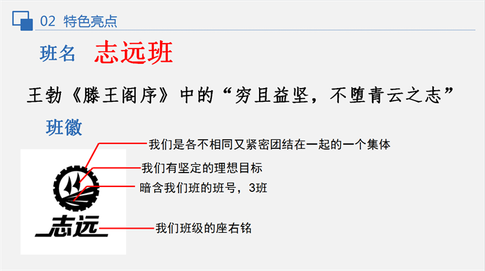 高三3班志遠班,取自唐代著名文人王勃《滕王閣序》中的“窮且益堅,不墮青云之志”之意。班級的特色概括為“激發(fā)學生內驅動力,培養(yǎng)學生自主成長能力”,在貫徹立德樹人的育人理念中堅持以人為本,尊重班集體中的每一個個體,通過班級文化建設和管理制度營造良好的班風學風,以“三班人,三班魂,三班爭當人上人”為口號,激發(fā)學生的內驅動力,通過典型同學的激勵,以“所謂成功,就是在平凡中做出不平凡的堅持”這句話作為價值引領,希望同學們在將來的發(fā)展中能夠明確自己的目標并且堅定而執(zhí)著地努力著,培養(yǎng)學生的堅韌品格和自主成長能力。