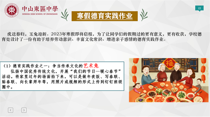 第四,對于寒假作業(yè)進(jìn)行布置,要主動、自覺、自律的安排好每天的計劃表,有效率、有效果的完成各科作業(yè)。為了讓寒假過得更有意義,更有收獲,學(xué)校德育處設(shè)計了一份有助于培養(yǎng)學(xué)生勞動意識、豐富文化常識、增進(jìn)親子感情的德育實(shí)踐作業(yè),希望同學(xué)們度過一個充實(shí)而有意義的假期生活。