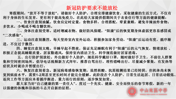 第二,黃天濤主任強(qiáng)調(diào)新冠防護(hù)要求不能放松,放開不等于放松,請各位同學(xué)做好個人防護(hù),合理安排健康飲食,保持健康的生活方式。希望大家做好自己健康的第一責(zé)任人,度過一個充實(shí)、健康、快樂的寒假,新的一年以強(qiáng)健的體魄開啟新征程。