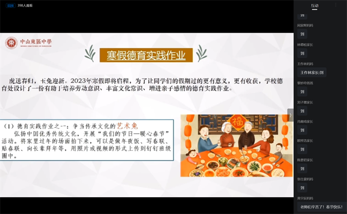 在散學(xué)禮上,德育處還為學(xué)生們布置了豐富而有趣的德育寒假作業(yè)。如弘揚(yáng)中國(guó)優(yōu)秀傳統(tǒng)文化,將家里過年的場(chǎng)面拍下來,做年夜飯、寫春聯(lián)、貼春聯(lián)、向長(zhǎng)輩拜年等,用照片或視頻的形式上傳到釘釘班級(jí)圈中;共讀一本好書。每個(gè)同學(xué)和父母在寒假里選擇一本名著、人物傳記等的書籍進(jìn)行閱讀。在讀書中與父母交流讀書的感受,在讀書中增進(jìn)與父母的感情,拍一張與父母同讀書的照片,寫出閱讀這本書的收獲與啟發(fā)的紙質(zhì)版,用親子共讀合影和手寫讀后感的形式上傳到釘釘班級(jí)圈中等。