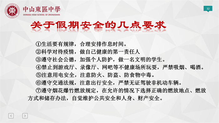 說起假期,“安全”是極其特別重要的關(guān)鍵詞。為了加強同學(xué)們的法律意識和安全意識,提高自我保護的能力,我校邀請了紫馬嶺派出所警察為同學(xué)們進行了一場寒假安全教育講座,內(nèi)容豐富、意義深遠。此外關(guān)于假期安全,彭主任特別強調(diào):希望同學(xué)們在假期能夠合理安排作息時間;加強自身安全思想意識,注意用電安全、交通安全;陽康后的一些注意事項等。