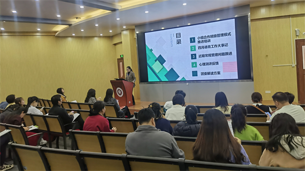 在本次的小組合作班級管理模式推進(jìn)培訓(xùn)會議中,梁可盈老師為全體班主任作題為《小組合作賦能班級管理》的班級管理經(jīng)驗(yàn)分享。梁老師以班級管理的痛點(diǎn)與期望為導(dǎo)入,分享了高一6班的班級管理運(yùn)轉(zhuǎn)模式。從小組合作制度的推行、班級構(gòu)造的完善、評分細(xì)則的敲定、反饋方式的多樣化等角度提出了班級管理的優(yōu)化建議。小組合作制度與德育考核評分制度的深度融合,提高了班主任的管理效率與有效性,調(diào)動(dòng)了學(xué)生參與班級管理的積極性,激發(fā)了內(nèi)部驅(qū)動(dòng)力;實(shí)現(xiàn)了與學(xué)生、與家長的高效、有效溝通;能引導(dǎo)學(xué)生真正地實(shí)現(xiàn)“有則改之,無則加勉”,為班級管理減壓賦能。